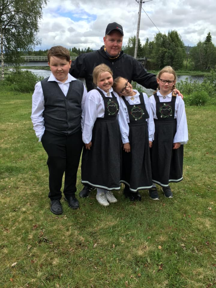 Til venstre: Kransgutt Marius Elnes Sellæg og kransjenter Ingeborg Bratli, Tomine Musum, Lotta Elnes Ness sammen med leder i Veresfestivalen Vegard Ottermo.